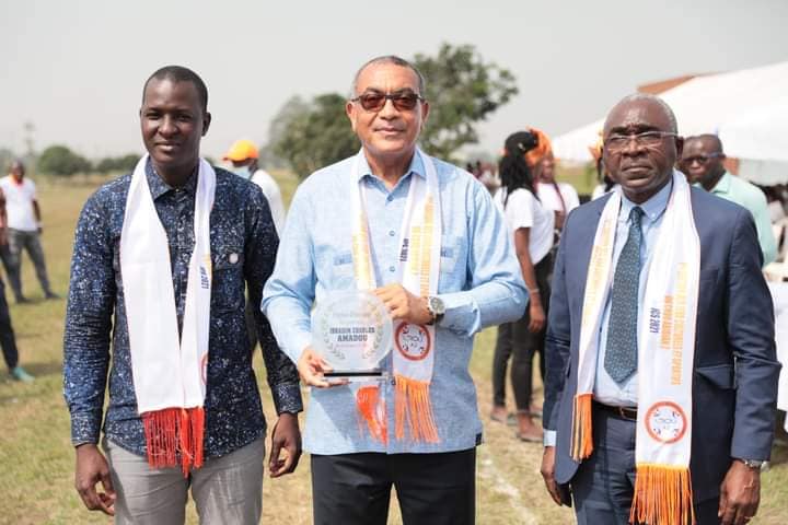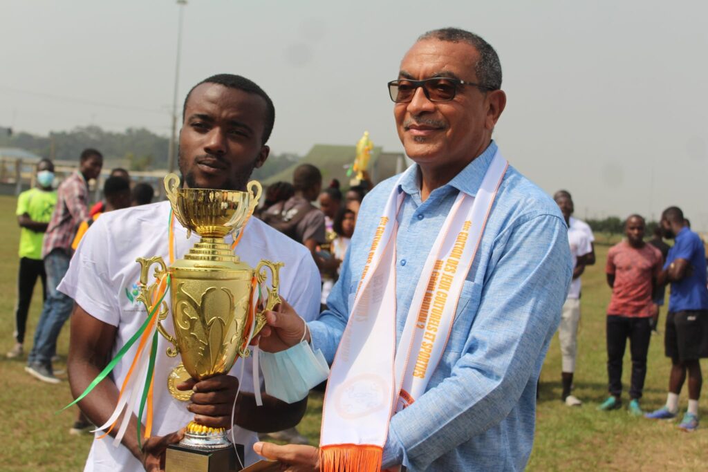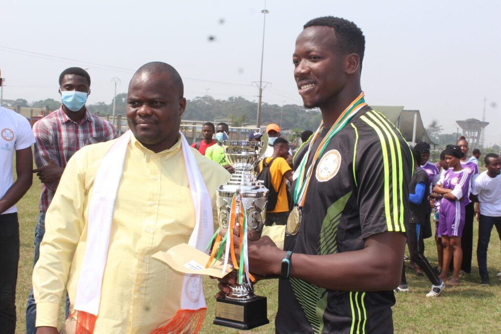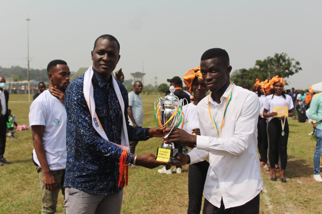 Dr. Bafétigué OUATTARA, Directeur du CROU A2 remet le trophée à l’équipe fair-play des jeux culturels et sportifs.