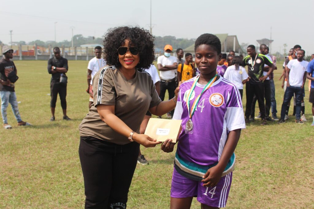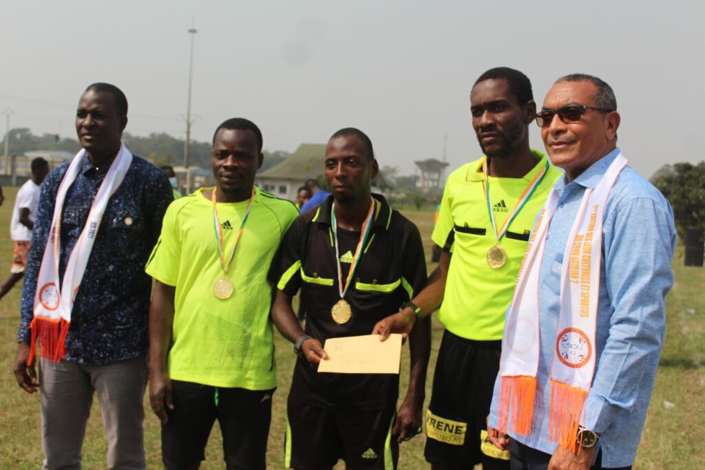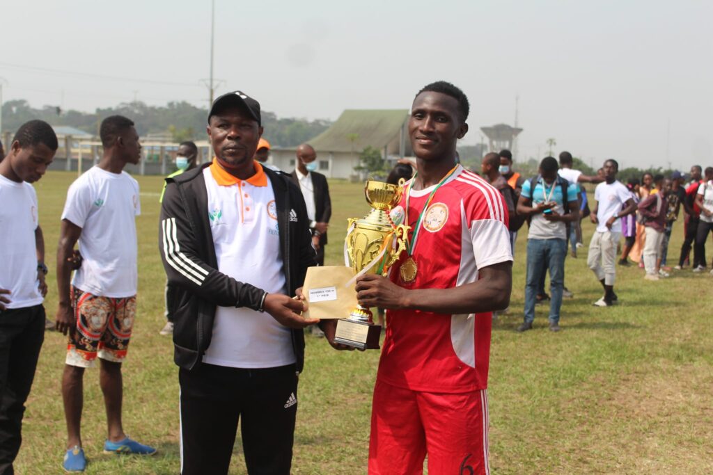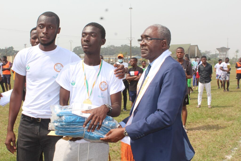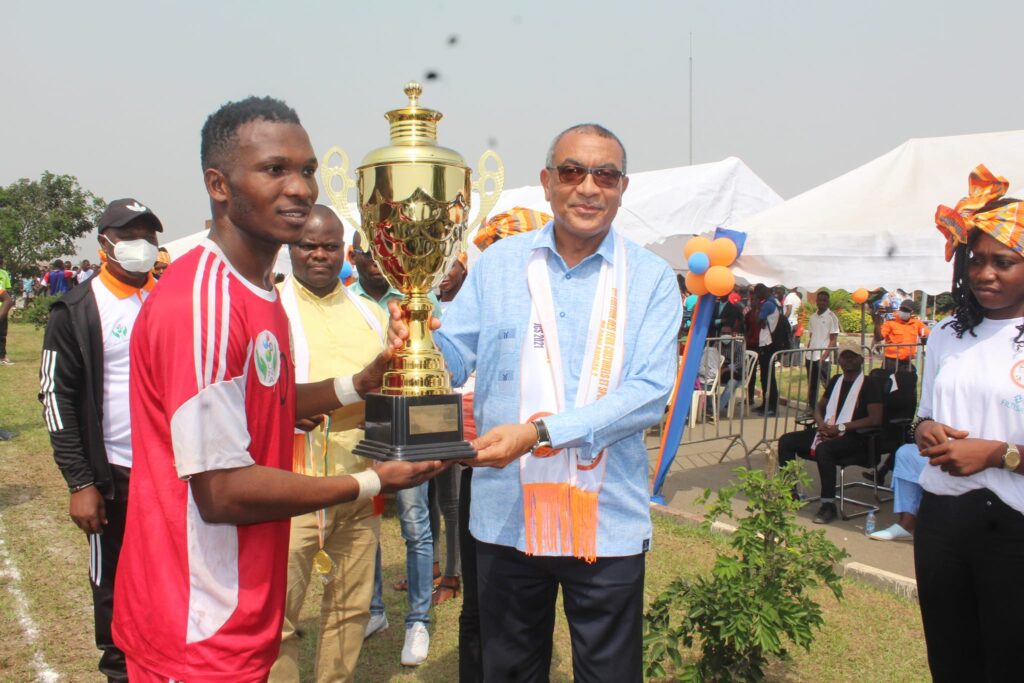 La remise du trophée au vainqueur du football dans la catégorie homme par le DG de FILTISAC