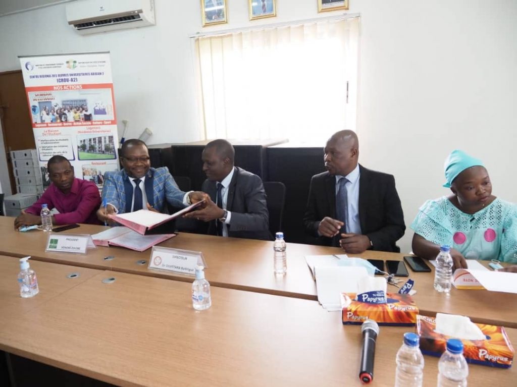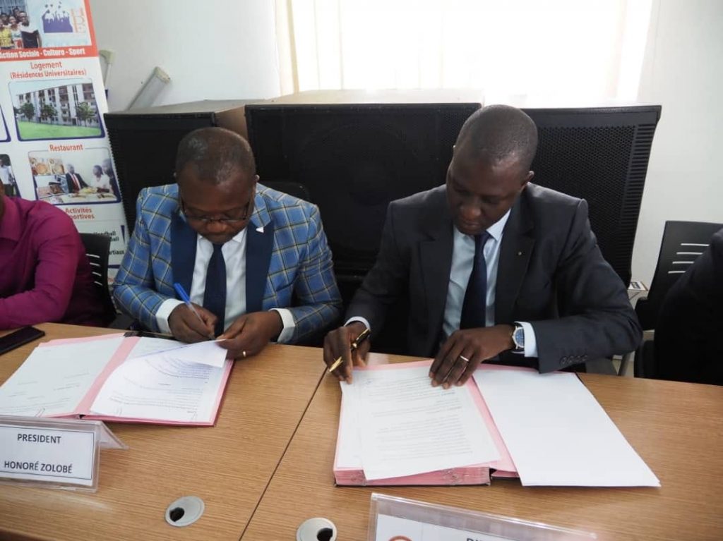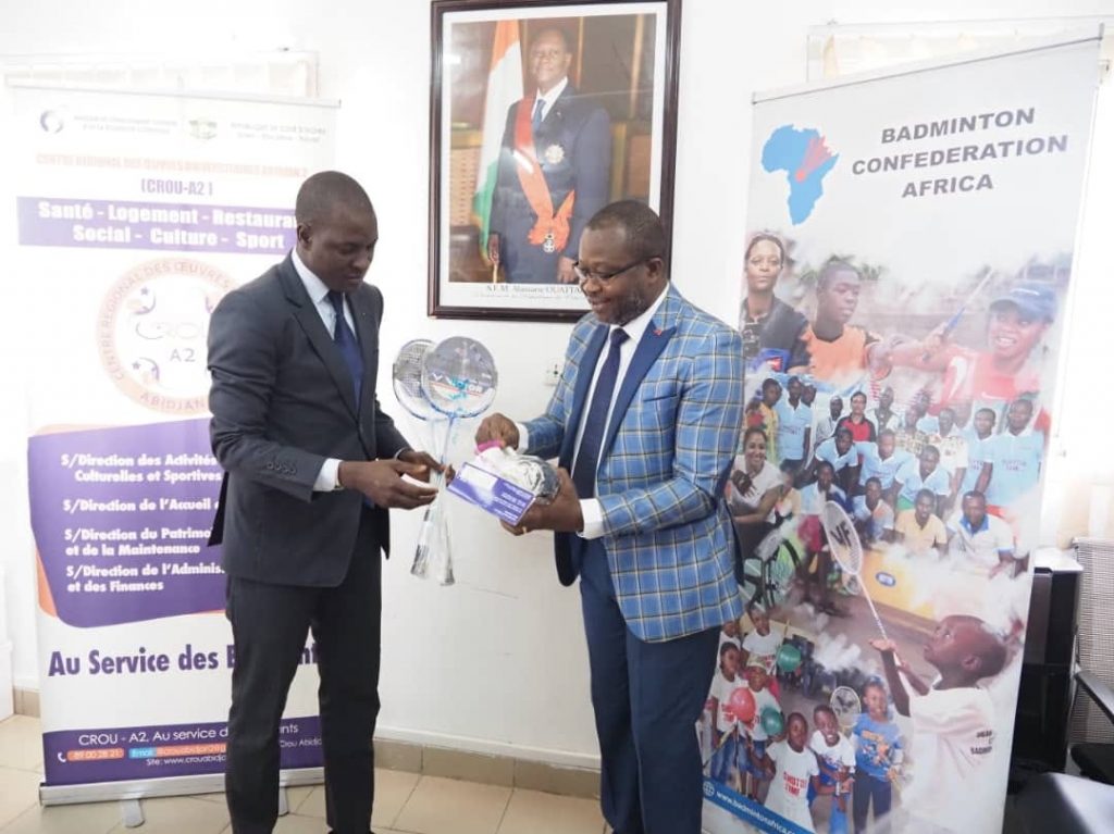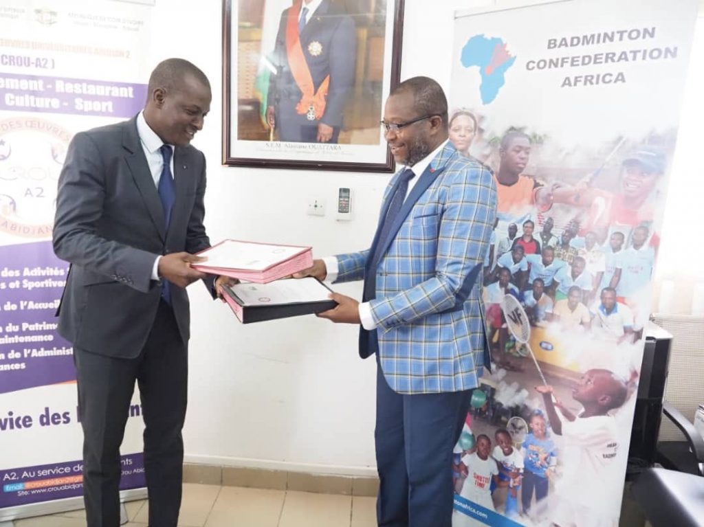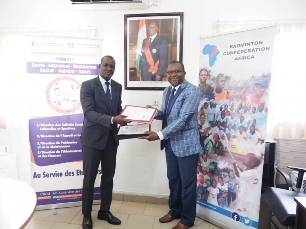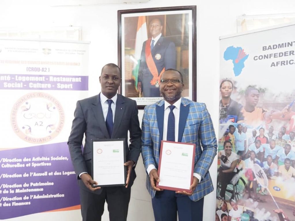 Le Centre Régional des Œuvres Universitaires d’Abidjan 2 et la Fédération Ivoirienne de Badminton (FIBAD) ont signé une convention de partenariat, le lundi 21 mars 2022 à la salle de conférence du CROU Abidjan 2.Le Directeur du CROU Abidjan 2 a indiqué que ce partenariat vise à promouvoir le Badminton en milieu universitaire. Pour le Docteur Bafétigué OUATTARA, cette convention contribuera à occuper sainement les étudiants, à travers la pratique de ce sport et permettra, a-t-il renchéri, de tracer les sillons d’un Badminton ivoirien compétitif à l’international.Quant au Président de la FIBAD, Monsieur Honoré ZOLOBÉ, il s’est réjoui de cette coopération qui, selon lui, cadre avec la vision de sa fédération qui s’est fixée pour objectif de faire connaitre au grand public cette discipline sportive .Le CROU Abidjan 2 compte 9 clubs sportifs parmi lesquels le Club de Badminton. A travers ces clubs qui participent aux activités du Centre Régional des Œuvres Universitaires Abidjan 2 et aux compétitions nationales, ce sont les talents sportifs des étudiants qui sont mis en exergue par le CROU Abidjan 2.